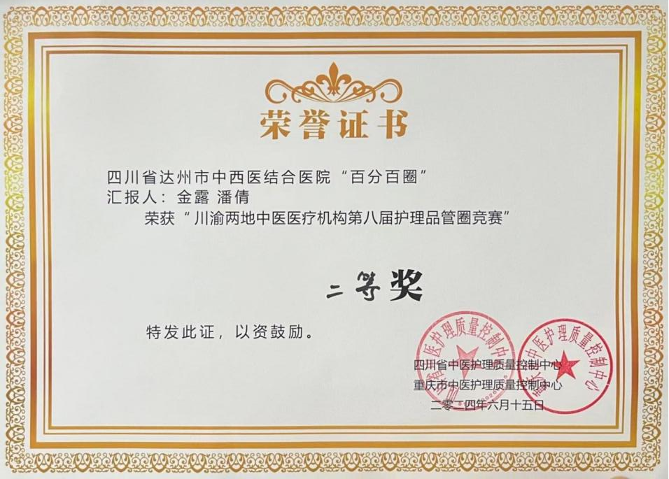 6月15日,在“川渝两地中医医疗机构第八届护理品管圈竞赛上,我院推送的眼科“百分百圈”(课题研究型)以《基于PDCA构建儿童近视防控科普培训平台》为主题荣获大赛二等奖。